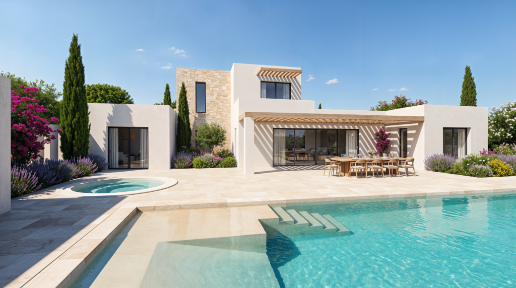 Imagen 3D de una vivienda moderna en el campo, destacando su arquitectura y el paisaje natural circundante.